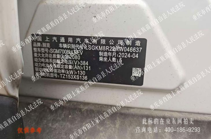 拍卖标的:车牌号为苏DA06655别克牌小型轿车,本次拍卖不含车牌。根据车辆注册登记信息显示:车辆品牌别克牌,车身颜色:白色,车辆识别代号/车架号:LSGKM8R22RW046637,发动机号:MHE240660178,登记日期:2024年5月10日,出厂日期:2024年04月17日,使用性质:预约出租客运,燃料种类:电,国产,行驶里程:88355公里(此数据仅供参考,实际以交付车辆表盘显示为准)。标的物车辆年检证明不详,车辆行驶证、购置税证书、车船税证明、交强险未提供。更多车辆信息请查看附件《询价报告》。